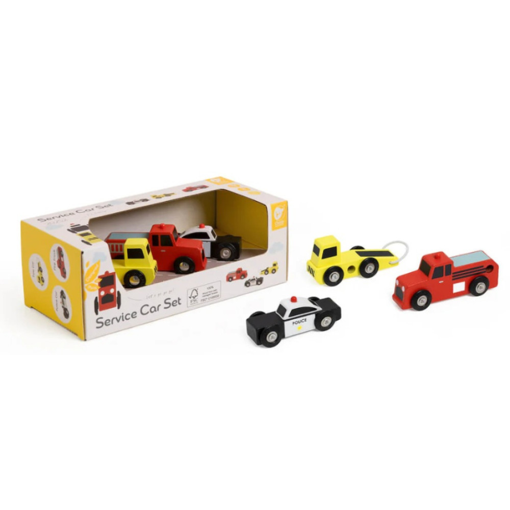 Este set de vehículos incluye una grúa, un camión de bomberos y un coche de policía.