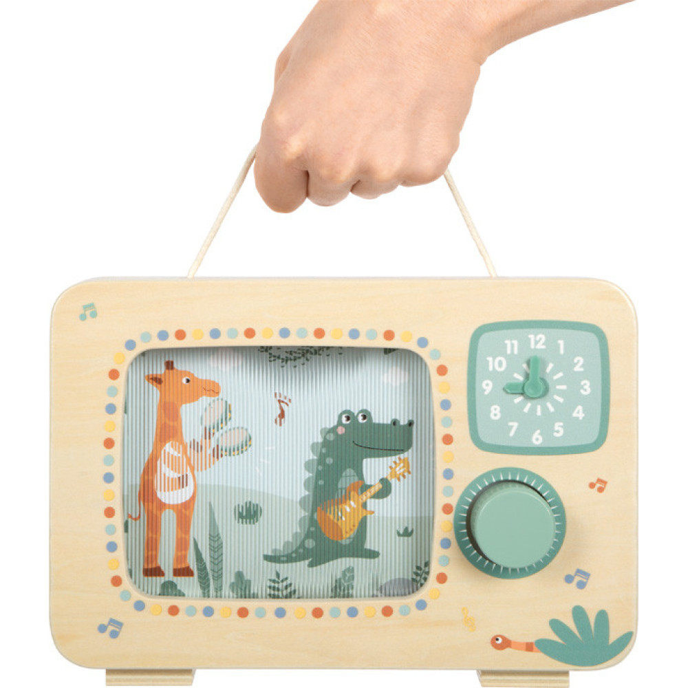 ¡Una orquesta de TV para la habitación infantil! Con esta gran caja de música en forma de un televisor, fabricada con madera FSC® 100% certificada, los niños podrán ver cómo cobra vida la orquesta alegre de animales de la sabana.