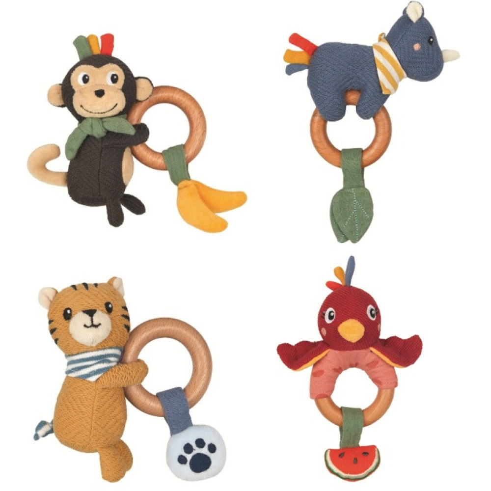 Sonajero de peluche, con anillo de madera, ofrece a los bebés un entretenimiento lúdico.