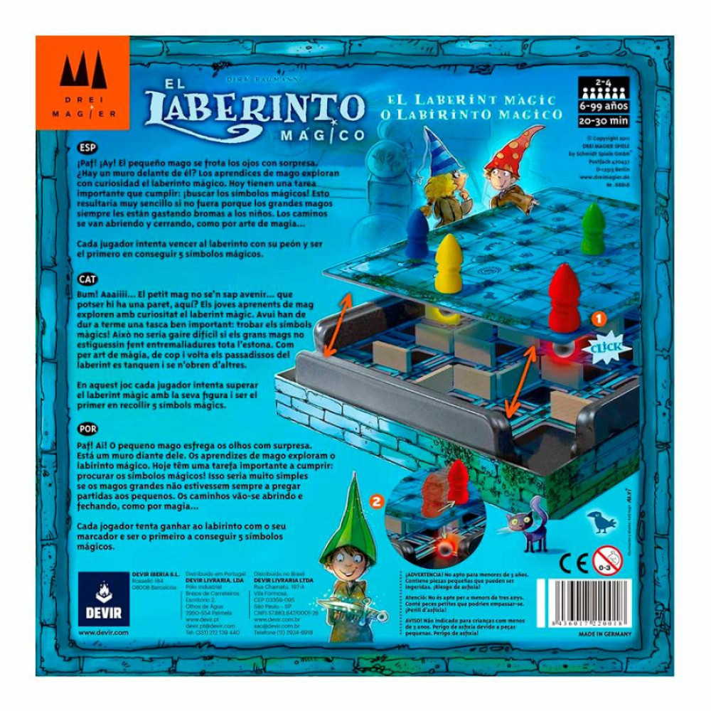 Contiene un tablero de juego en dos niveles, 24 muros de madera, 24 fichas con símbolos mágicos y bolsa de tela para guardarlos, 1 dado especial, 4 magos (peones) en color rojo, azul, amarillo y verde, 4 bolas metálicas y guía de juego.
