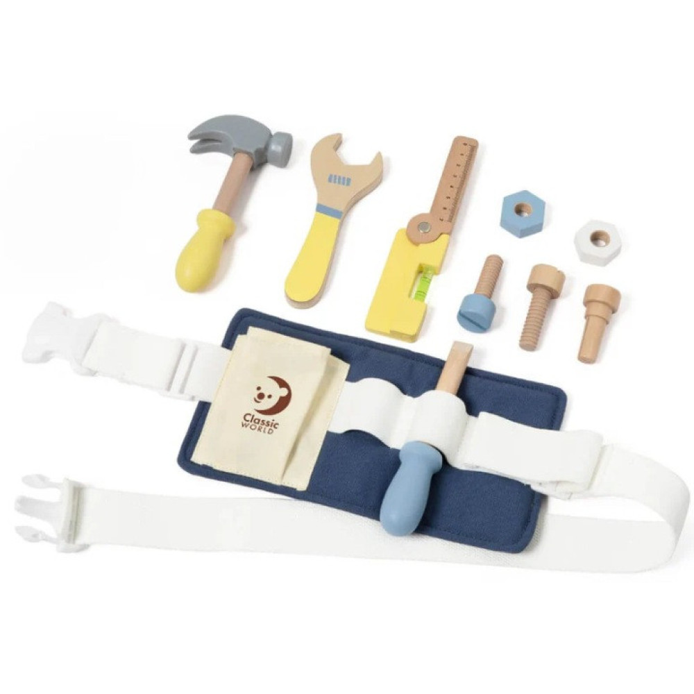 Este cinturón de herramientas contiene herramientas y accesorios de carpintería.
