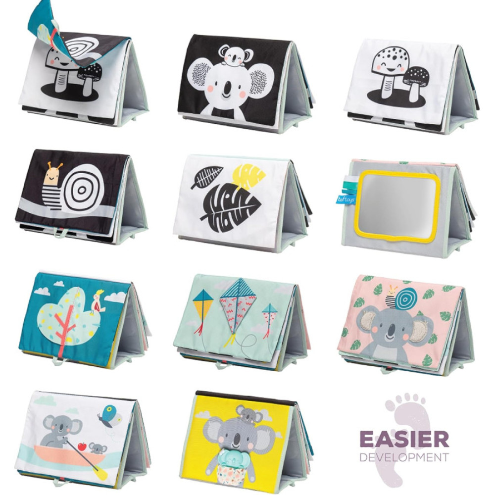 Un libro de tela en forma de caballete, para que el niño pase página tras página, ¡y descubra las texturas y actividades!