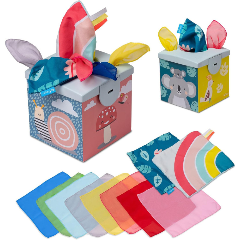 Varias actividades: extraer los pañuelos, y volver a colocarlos dentro de la caja. El agujero de la caja está especialmente concebido para adaptarse a las manos de los bebés. Promueve el juego sensorial con texturas y sonidos, y permite el reconocimiento de los colores