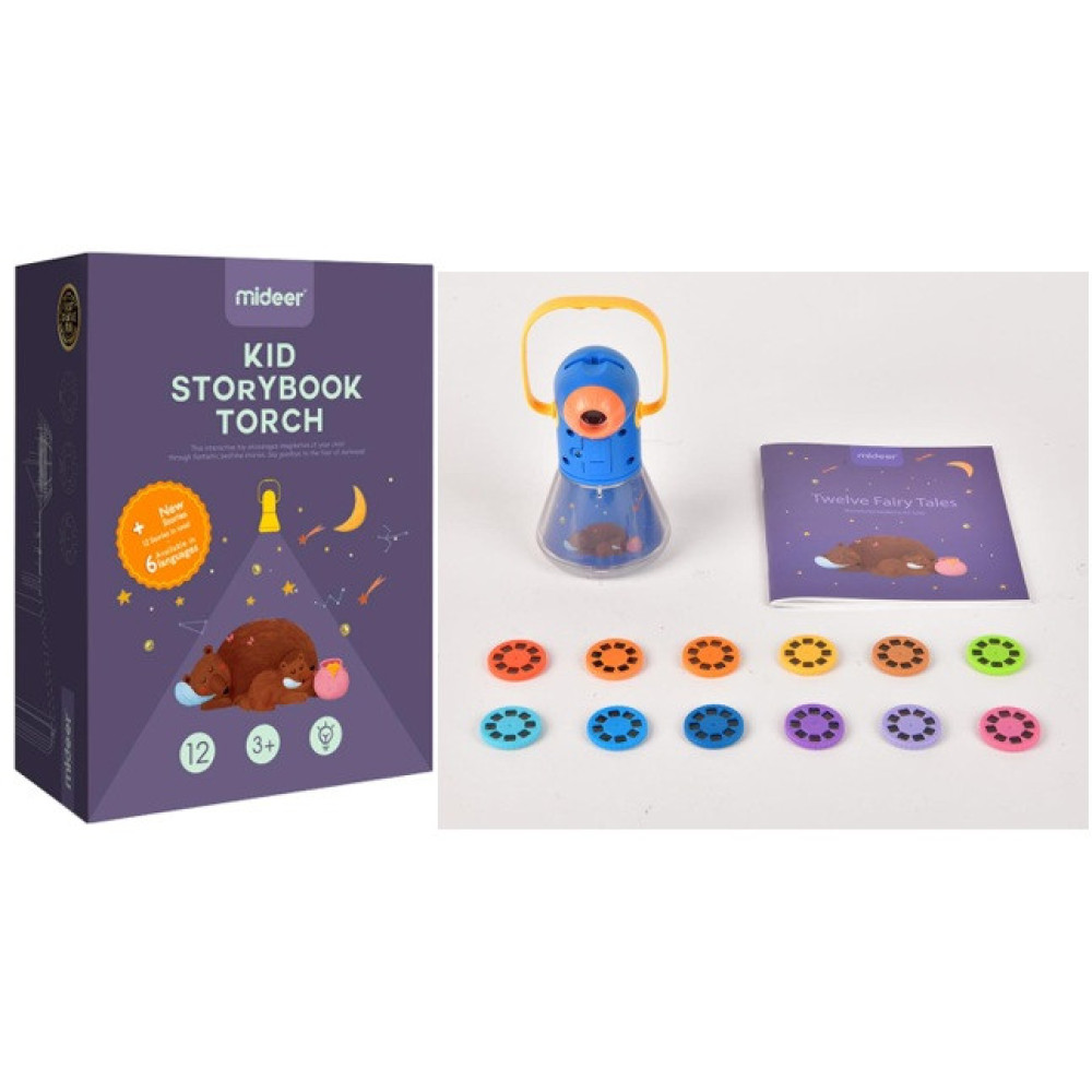 Contiene proyector de 7,5 x 15,50cm., libro de cuentos y 12 discos con cuentos para proyectar.