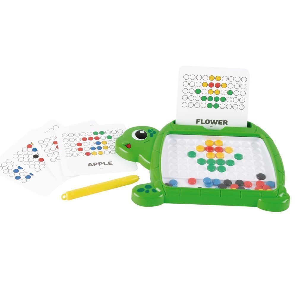 Cada set incluye una pizarra con base imantada, un lápiz magnético y dots magnéticos de colores, además de 10 fichas con diseños que los niños pueden reproducir o combinar libremente.