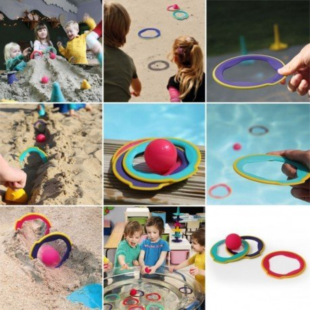 ¡6 discos y 1 pelota con las jugar de 100 maneras! Un juego multifunción que podemos usar en el agua, en el jardín, en la playa... Con muchas posibilidades y fácil de llevar.