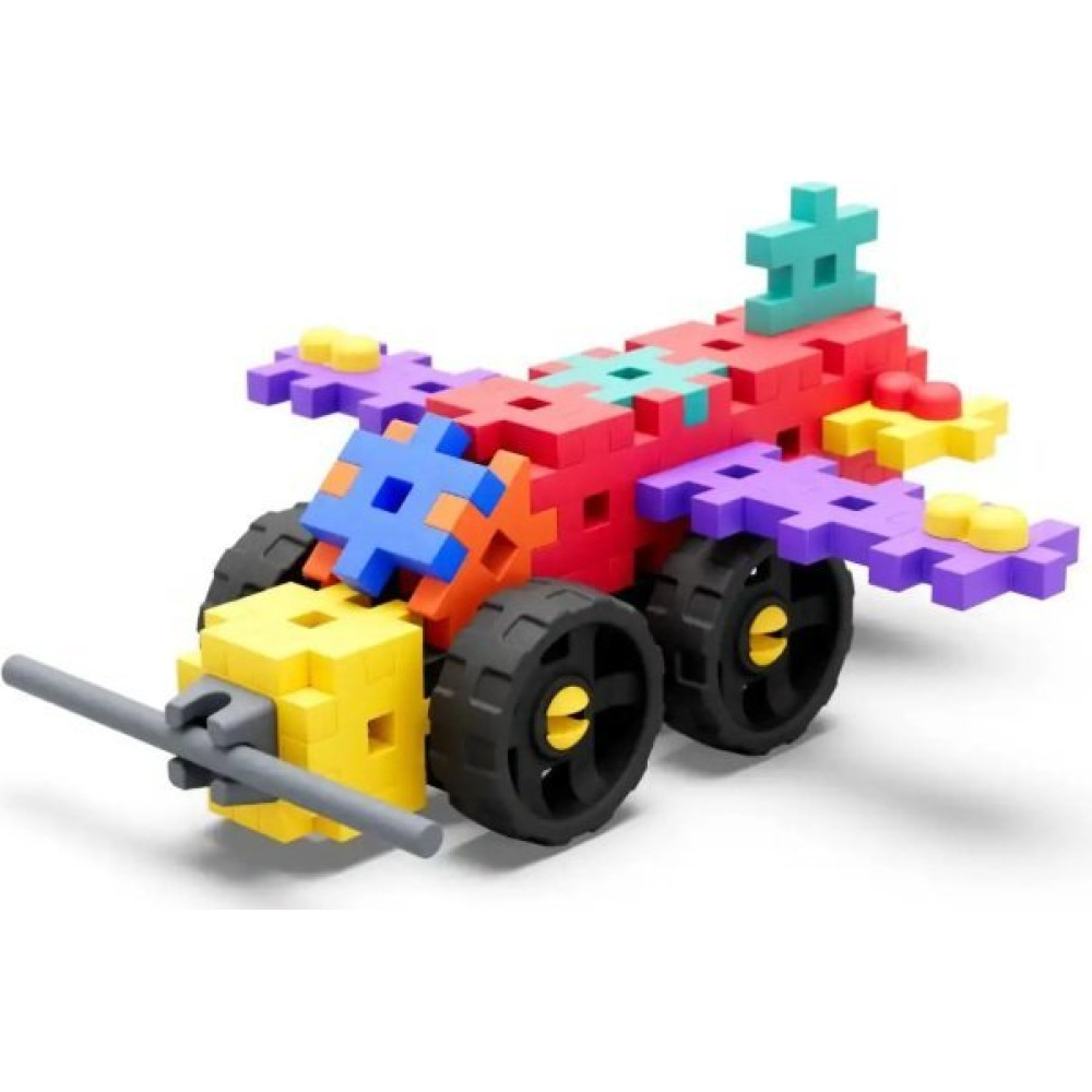 Al combinar piezas planas con ruedas y ejes, los pequeños constructores aprenden cómo funcionan los mecanismos simples.