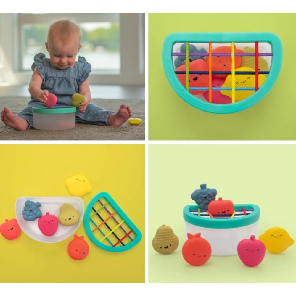 Este juguete sensorial tiene diversas frutas con textura para que el bebé pueda aprender la forma y el color de cada fruta y jugar a meter y sacar las frutas del contenedor.