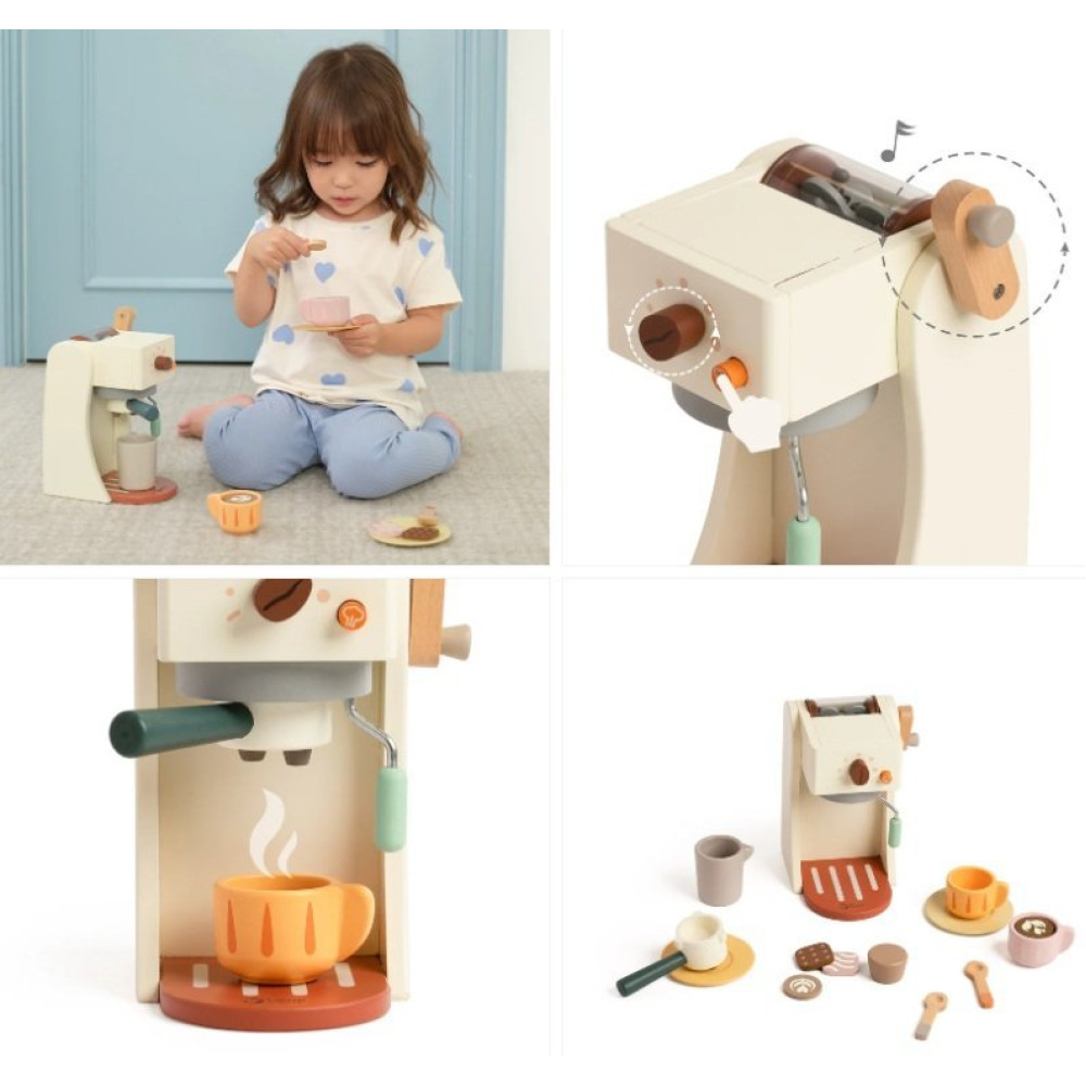 Esta simpática cafetera tiene muchas funciones emocionantes, como un molinillo de café, un asa para poner el café, dos cucharitas, dos tazas de café, una mini jarra de leche y unas preciosas galletas de juguete.