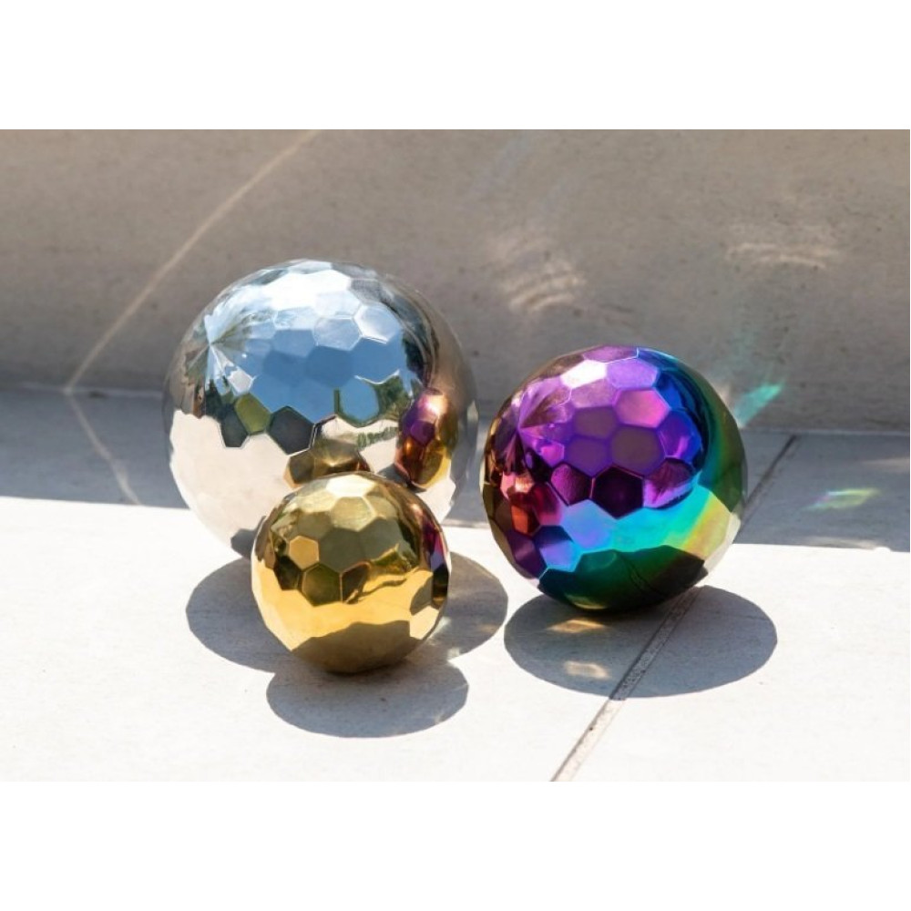 Acabadas en brillante oro, plata y vibrantes tonos de colores, cada bola cuenta con un interior único que crea sonidos y movimientos sorprendentes, además de superficies maravillosamente irregulares que hacen que rodar sea deliciosamente impredecible.